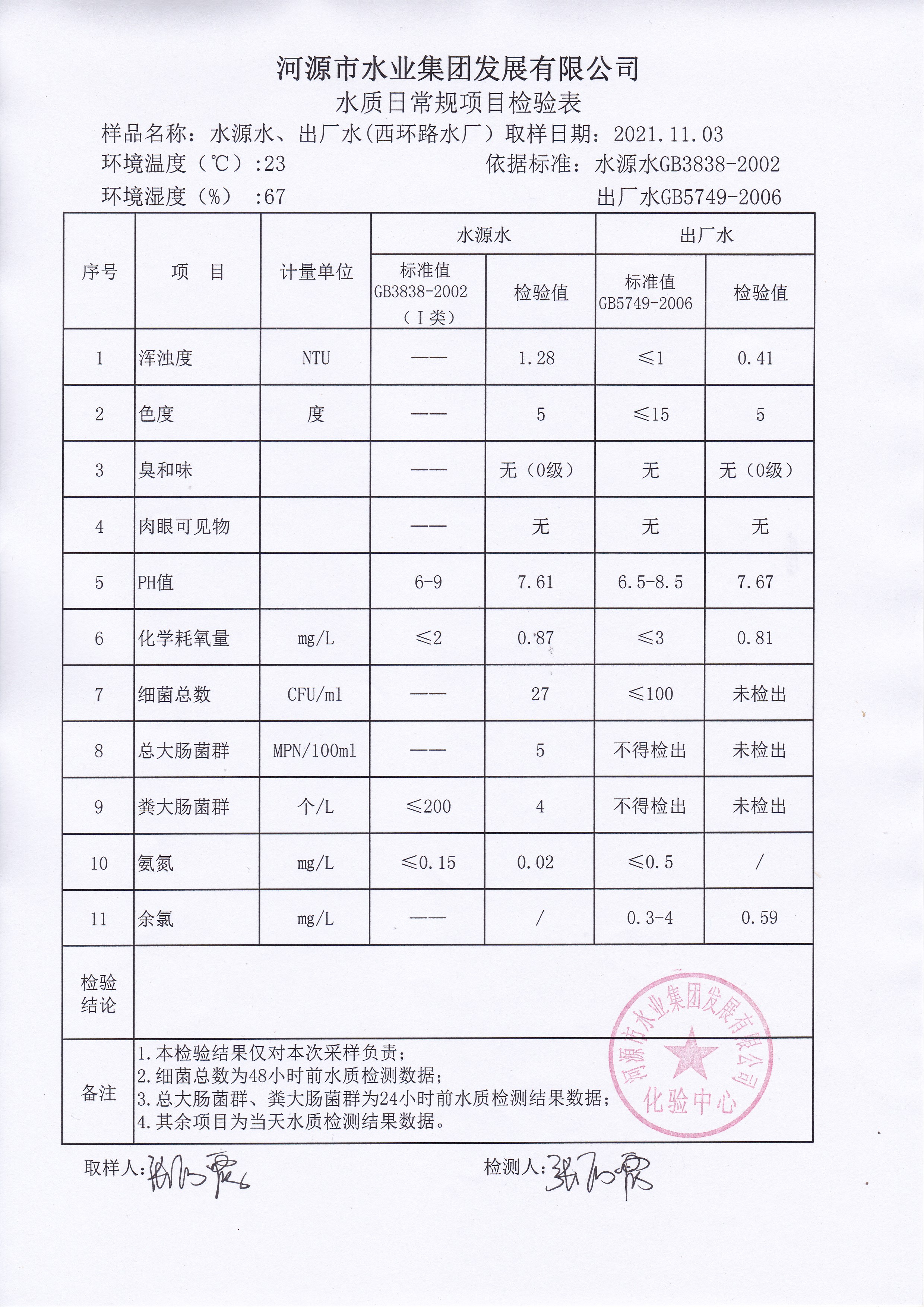 2021年11月3日水質(zhì)檢驗報告