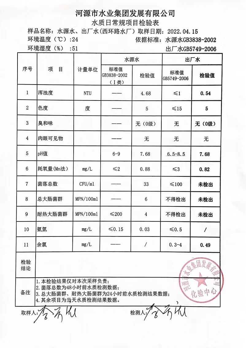 2022年4月15日水質(zhì)檢驗(yàn)報(bào)告